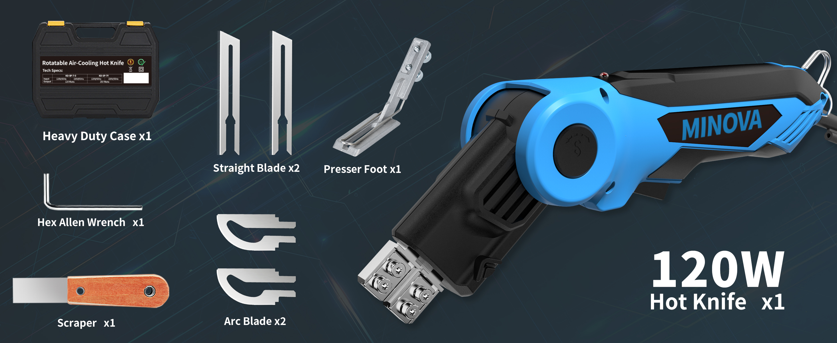 - ✅【Package Includes】1 MINOVA Fabric Rope Cutter, 2 arc blades, 2 straight 2" blades, 1 pressure foot, 1 scraper, 1 hex wrench, and 1 heavy-duty carrying case.
