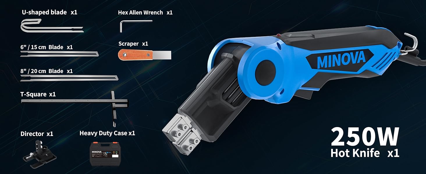 ✅【Packing List】Includes MINOVA hot knife*1, 8" blade*1, 6“ Blade*1, 6" U-type blade*1, T-square&director*1, scraper*1, hex allen wrench*1 and heavy duty case*1.