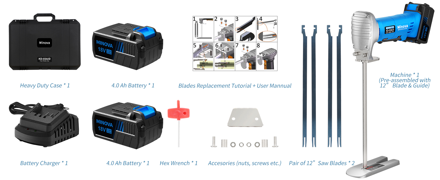 - 【HANDY KIT】Includes Minova foam rubber saw, one pair of 12” blades for replacement, blade installation guide, manual, hard plastic case, hex wrench, spare nuts, screws and cover. Easy to carry after use.